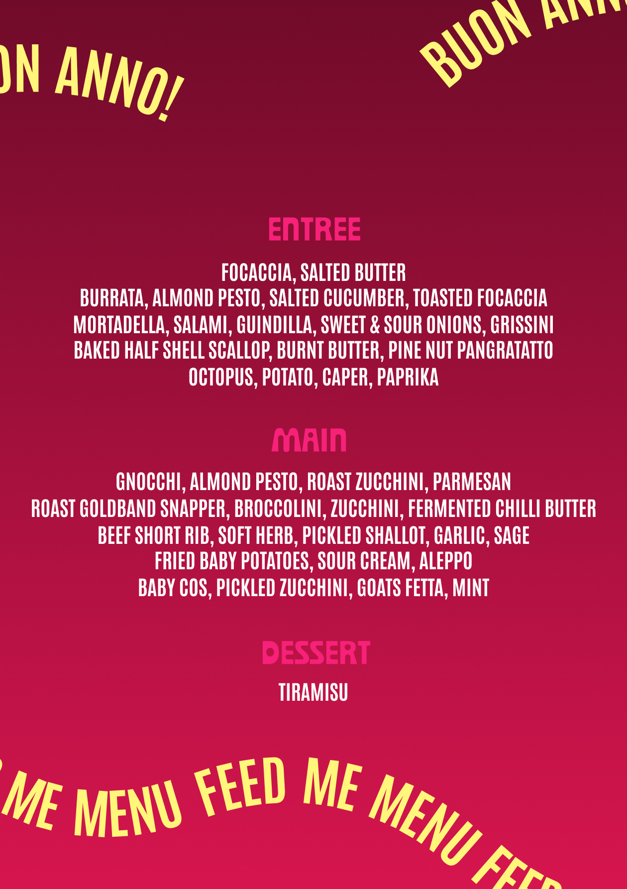 Dine à la carte, or enjoy the Buon Anno! Feed Me Menu a special menu we've put together for NYE. $85 per person.